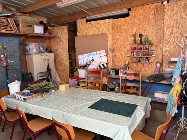 בגלל הגודל גם יכולתי לשמור כמה חפצים מתפאורות של הצגות ( שחלקן הגדול נבנו על ידיי והילדים בסדנה) וכל מיני דברים שאין איפה לשים אותם. יש שולחן מספיק גדול ל- 6-7 ילדים ומספיק אינטימי לאווירה טובה למפגש פרטני אחד על אחד. יש שם חדר פנימי, סוג של מחסן ששייך לדני אב הבית והוא השיתוף הכי טוב שאפשר לבקש בעיקר כשעובדים עם חומרים ומנסים למצוא פתרונות יצירתיים בבניה של דברים.